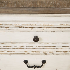 Bon appétit. This dining package has all the right ingredients for a French country-inspired feast for the eyes. Enhance your dining area and serve up a place for casually cool entertaining. Its antiqued two-tone aesthetic pairs a chipped white with distressed wood finished top and for twice the charm. Plushly cushioned seats are covered in textured oatmeal-tone fabric.