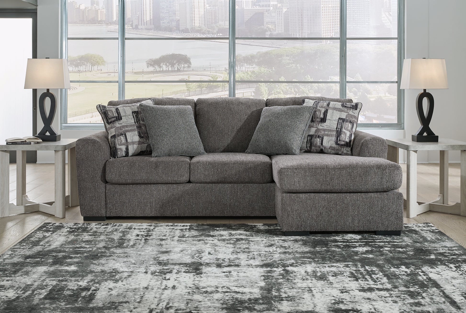 Details Corner-blocked frame, Attached back and reversible seat cushions, Chaise can be positioned on either side (thanks to reversible seat cushion and movable ottoman), High-quality foam cushions wrapped in poly fiber, Accent pillows included, Pillows with soft polyfill, Polyester upholstery, Exposed feet with faux wood finish, Platform foundation system resists sagging 3x better than spring system after 20,000 testing cycles by providing more even support, Smooth platform foundation maintains tight, wrinkle-free look without dips or sags that can occur over time with sinuous spring foundations