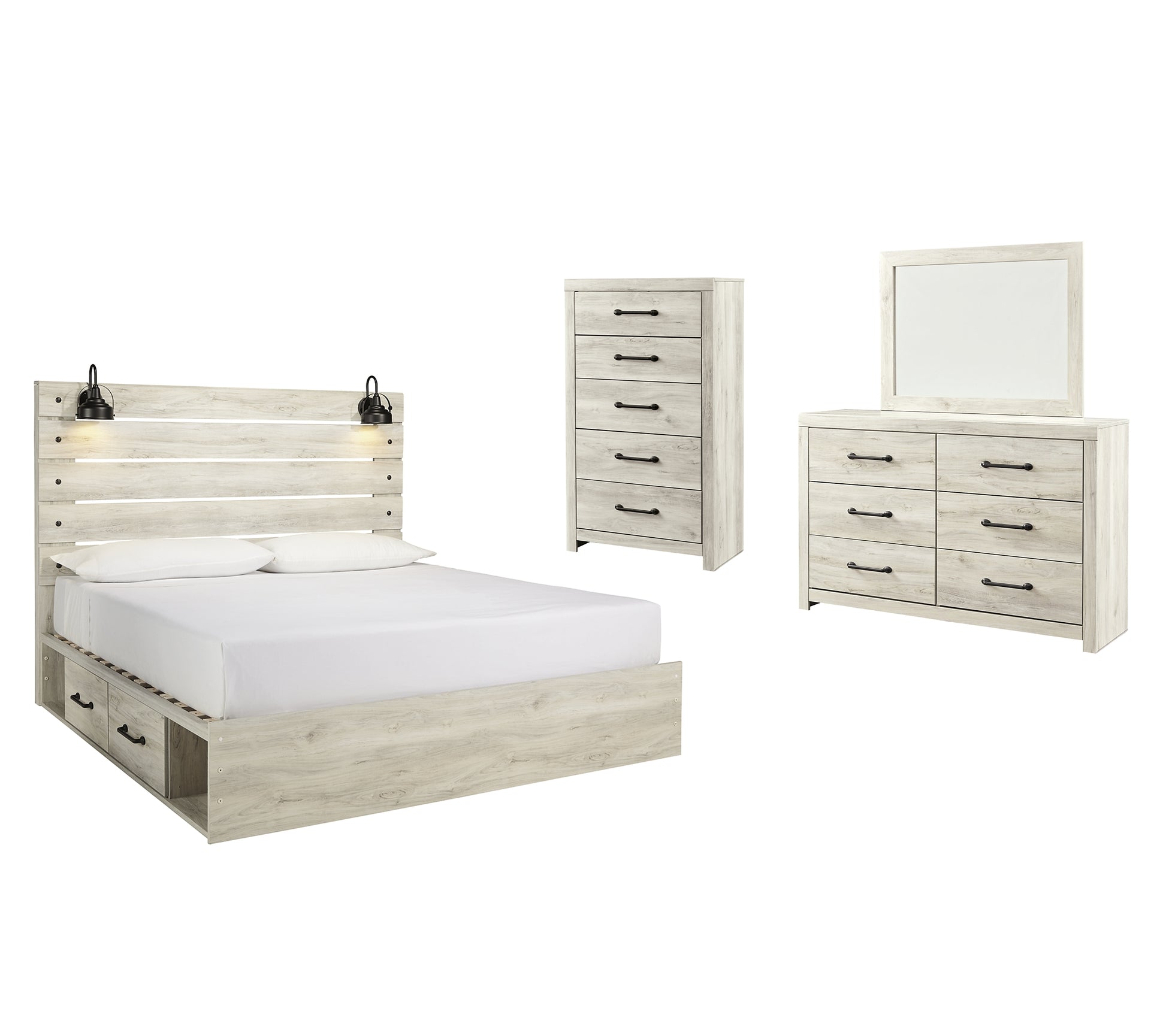 Details B192-46: Made of engineered wood (MDF/particleboard) and decorative laminate, Wispy white finish over replicated oak grain with authentic touch, Large-scale hardware with dark finish, 5 smooth-gliding drawers, Drawer interiors are lined with a faux linen laminate for a clean, finished look, Safety is a top priority, clothing storage units are designed to meet the most current standard for stability, ASTM F 2057 (ASTM International), Drawers extend out to accommodate maximum access to drawer interior while maintaining safety, B192B19: Includes headboard, footboard, side storage, rails and slats, Made of engineered wood (MDF/particleboard) and decorative laminate, Wispy white finish over replicated oak grain with authentic touch, Large-scale hardware with dark finish, 2 decorative sconce lights, LED with 3 AA batteries, 2 smooth-gliding storage drawers, 2 storage cubbies, 2 slim-profile USB charging ports, Power cord included; UL-listed, Bed does not require additional foundation/box spring; accommodates most zero clearance adjustable bases with the addition of a bunkie board, Mattress available, sold separately, Assembly required, B192B1: Includes dresser with mirror, Made of engineered wood (MDF/particleboard) and decorative laminate, Wispy white finish over replicated oak grain with authentic touch, 6 smooth-gliding drawers, Drawer interiors are lined with a faux linen laminate for a clean, finished look, Large-scale hardware with dark finish, Mirror attaches to back of dresser, Assembly required, B192-92: Made of engineered wood (MDF/particleboard) and decorative laminate, Wispy white finish over replicated oak grain with authentic touch, Large-scale hardware with dark finish, 2 smooth-gliding drawers, Drawers lined with faux linen laminate for finished aesthetic, 2 slim-profile USB charging stations, Power cord included; UL Listed,