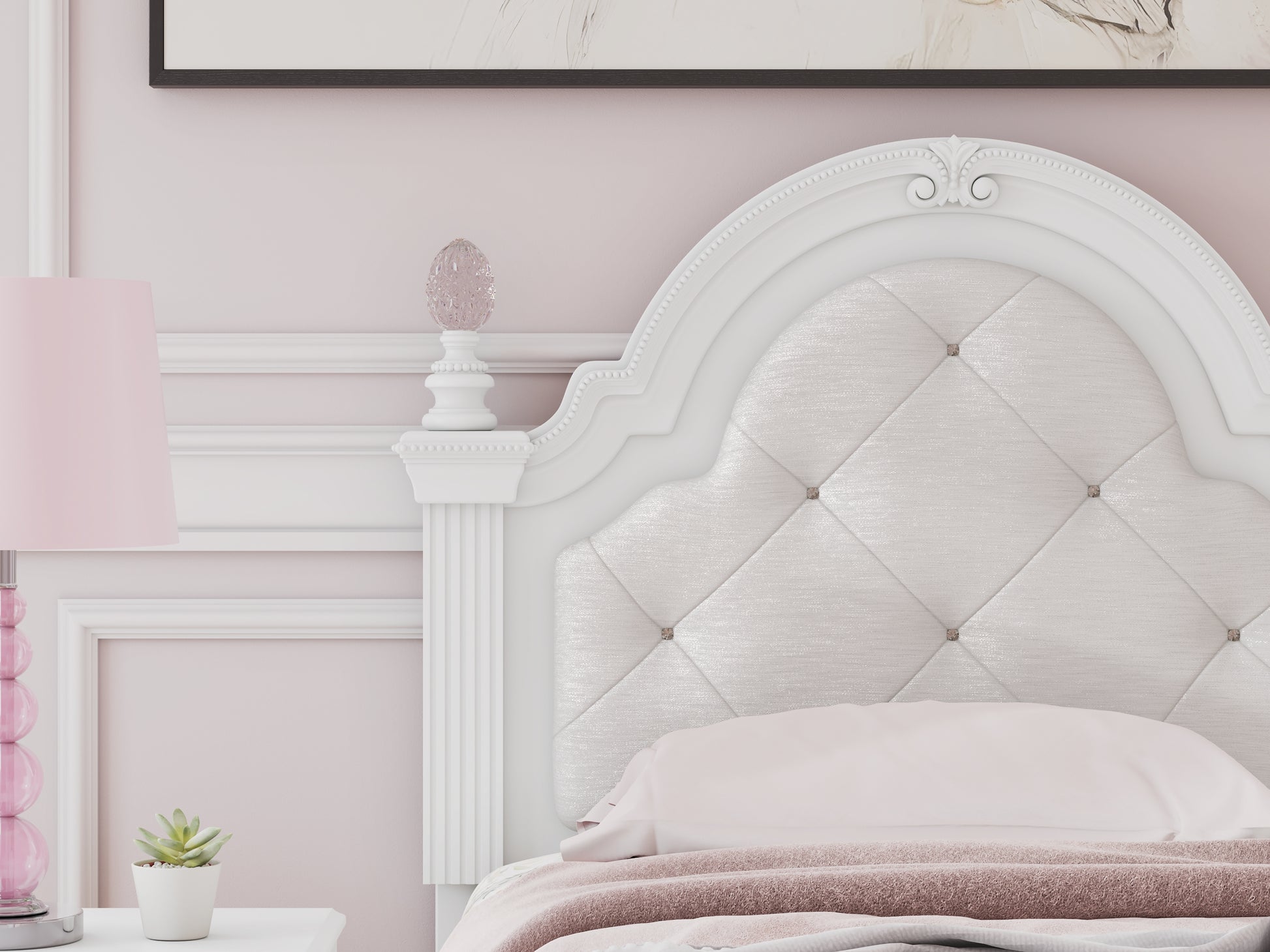 Details PCB1819B9: Includes upholstered panel headboard, panel footboard, roll slats and side storage with rails, Made with engineered wood (MDF/particleboard/plywood) and decorative laminate for the right balance of affordability and durability , Matte white finish, Decorative laminate replicates natural or man-made material surfaces with consistent color, pattern and texture , Polyester upholstery, Crystal drawer knobs; acrylic ball tops, 2 smooth-gliding drawers; drawer interiors are lined with a faux linen laminate for a clean, finished look, Open cubbies accommodate any 10.5" W x 10.5" D x 11" H storage bin (not included), Pink, purple and white LED lighting options; touch button control, Power cord included; UL Listed, Bed does not require additional foundation/box spring; accommodates most zero clearance adjustable bases with the addition of a bunkie board, Mattress available, sold separately, Minor assembly required, PCB1819B2: Includes dresser and mirror, Made with engineered wood (MDF/particleboard/plywood) and decorative laminate for the right balance of affordability and durability , Matte white finish, Decorative laminate replicates natural or man-made material surfaces with consistent color, pattern and texture , Crystal drawer knobs, 6 smooth-gliding drawers, Drawer interiors are lined with a faux linen laminate for a clean, finished look, Safety is a top priority, clothing storage units are designed to meet the most current standards for stability, ATM F 2057 (ASTM International), Drawers extend out to accommodate maximum access to drawer interior while maintaining safety, Mirror can be mounted on wall vertically , Minor assembly required, PCB1819-91: Made with engineered wood (MDF/particleboard/plywood) and decorative laminate for the right balance of affordability and durability, Matte white finish, Decorative laminate replicates natural or man-made material surfaces with consistent color, pattern and texture, Crystal drawer knob, 1 smooth-operating drawer, Drawer interior is lined with a faux linen laminate for a clean, finished look, Open shelf, USB-A and USB-C charging ports, Pink, purple and white LED lighting options; touch button control, Power cord included; UL Listed, Minor assembly required,
