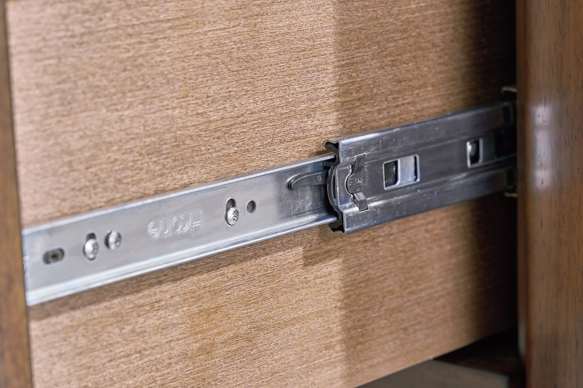 Details Made with hardwood solids, mango wood veneer and MDF substrates, Medium brown wood-tone finish, 2 drawers with fully finished interior, dovetail construction and heavy duty ball-bearing side glides, Round tapered legs, 110V power supply with USB-A and USB-C charging ports, Power cord included; UL Listed