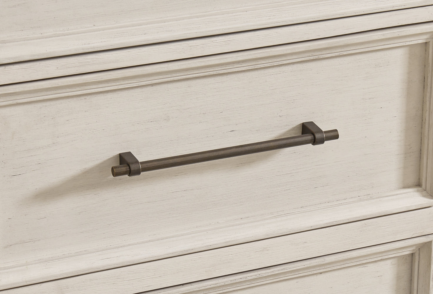 Details Includes dresser and mirror, Made with hardwood solids, veneers and MDF substrates, Two-tone finish (antiqued white and light gray wood tone), Dark bronze-tone bar pulls, 2 glass-front cabinets, each with single storage shelf, 5 drawers with fully finished interior, dovetail construction and heavy duty ball-bearing side glides (top drawer felt lined), Mirror attaches to back of dresser