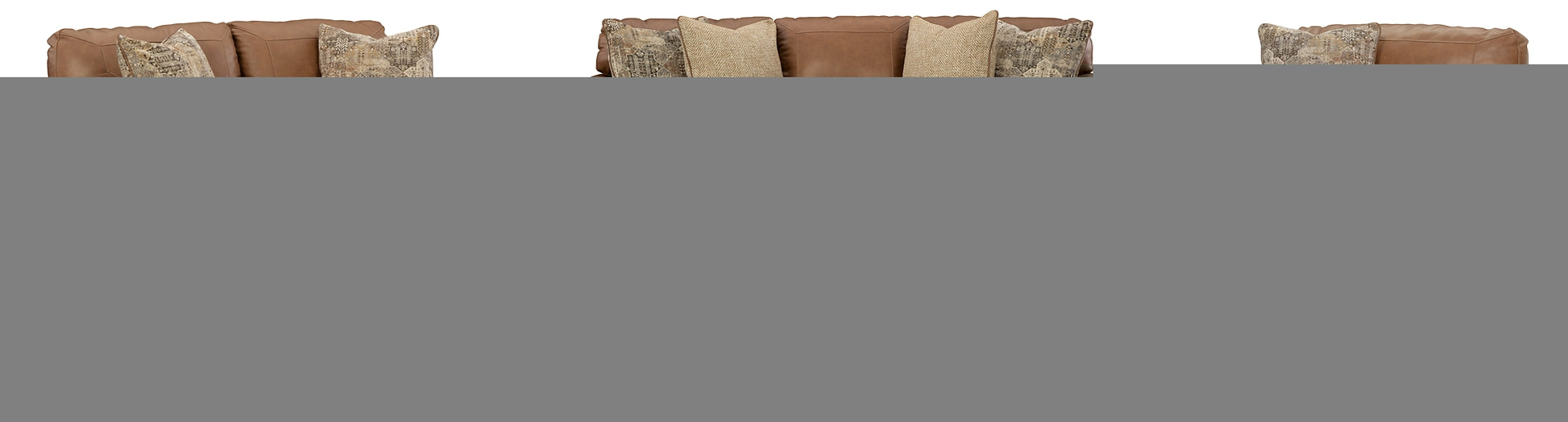 Details 5760438: Corner-blocked frame, Attached back and loose seat cushions, High-resiliency foam cushions wrapped in poly fiber, Accent pillows included, Pillows with feather-fiber blend, Genuine leather covers inside areas such as the back, seat and arm cushions; skillfully matched faux leather covers the remaining areas, Top-grain leather simulating a wax oil pullup with crackle effect, Lightly buffed and embossed with clear protective finish to prevent scratches, Due to its natural origin, real leather can show individual characteristics such as healed scars, growth marks, grain variation and shade variation, Natural variations make each hide unique and do not detract from the wearing qualities of leather, Decorative turn leg, Platform foundation system resists sagging 3x better than spring system after 20,000 testing cycles by providing more even support, Smooth platform foundation maintains tight, wrinkle-free look without dips or sags that can occur over time with sinuous spring foundations, 5760435: Corner-blocked frame, Attached back and loose seat cushions, High-resiliency foam cushions wrapped in poly fiber, Accent pillows included, Pillows with feather-fiber blend, Genuine leather covers inside areas such as the back, seat and arm cushions; skillfully matched faux leather covers the remaining areas, Top-grain leather simulating a wax oil pullup with crackle effect, Lightly buffed and embossed with clear protective finish to prevent scratches, Due to its natural origin, real leather can show individual characteristics such as healed scars, growth marks, grain variation and shade variation, Natural variations make each hide unique and do not detract from the wearing qualities of leather, Decorative turn leg, Platform foundation system resists sagging 3x better than spring system after 20,000 testing cycles by providing more even support, Smooth platform foundation maintains tight, wrinkle-free look without dips or sags that can occur over time with sinuous spring foundations, 5760423: Corner-blocked frame, Attached back and loose seat cushions, High-resiliency foam cushions wrapped in poly fiber, Accent pillows included, Pillows with feather-fiber blend, Genuine leather covers inside areas such as the back, seat and arm cushions; skillfully matched faux leather covers the remaining areas, Top-grain leather simulating a wax oil pullup with crackle effect, Lightly buffed and embossed with clear protective finish to prevent scratches, Due to its natural origin, real leather can show individual characteristics such as healed scars, growth marks, grain variation and shade variation, Natural variations make each hide unique and do not detract from the wearing qualities of leather, Decorative turn leg, Platform foundation system resists sagging 3x better than spring system after 20,000 testing cycles by providing more even support, Smooth platform foundation maintains tight, wrinkle-free look without dips or sags that can occur over time with sinuous spring foundations, 5760414: Corner-blocked frame, Firmly cushioned, High-quality foam cushion wrapped in poly fiber, 100% top grain leather covers the cushion top; skillfully matched faux leather covers the remaining areas, Top-grain leather simulating a wax oil pullup with crackle effect, Lightly buffed and embossed with clear protective finish to prevent scratches, Due to its natural origin, real leather can show individual characteristics such as healed scars, growth marks, grain variation and shade variation, Natural variations make each hide unique and do not detract from the wearing qualities of leather, Decorative turn leg,